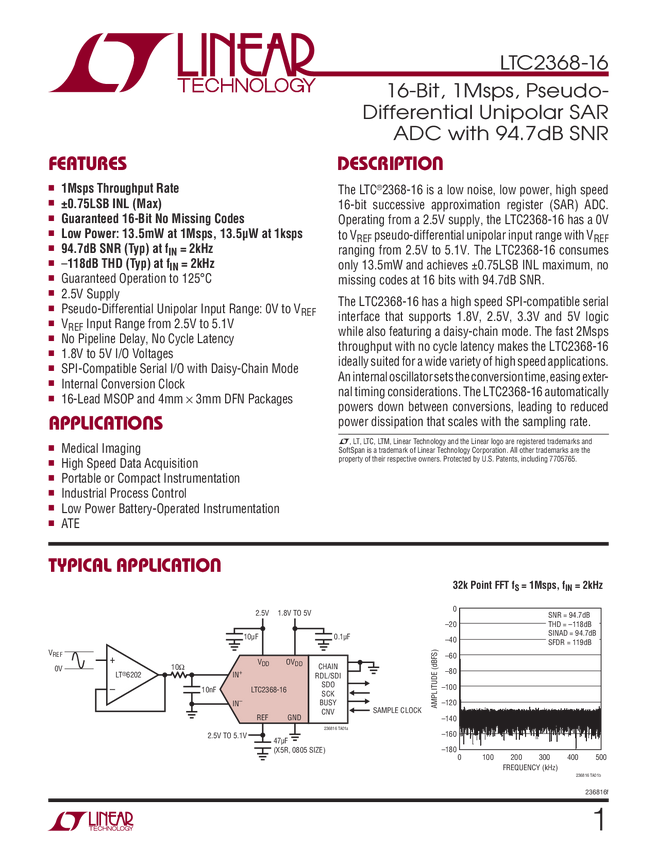 LTC2368-16 16-Bit, 1Msps, Pseudo-Differential Unipolar SAR ADC with 94.7dB SNR