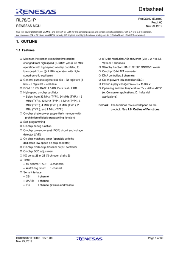 RL78/G1P Small Pin General-purpose Microcontroller with 12-bit A/D Converter and 10-...