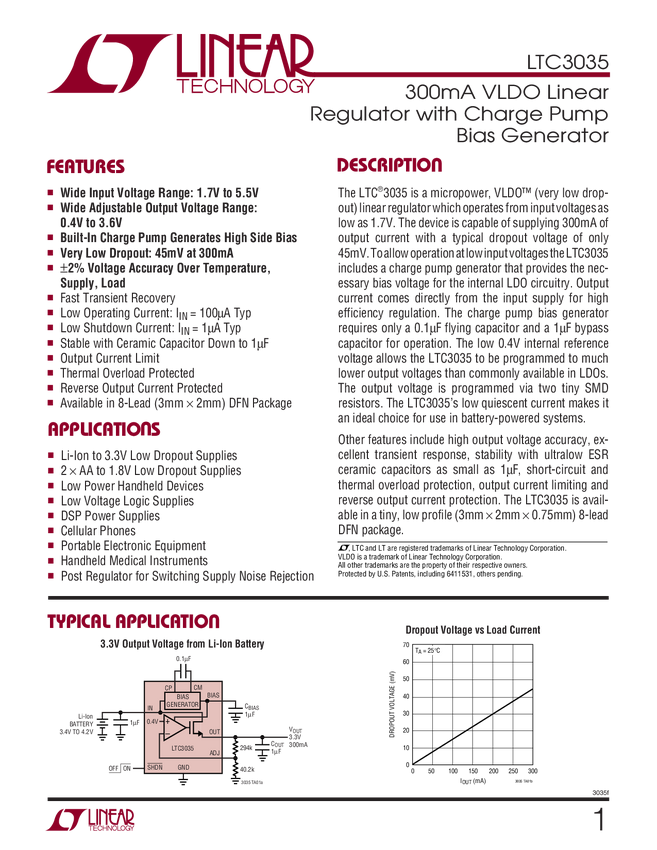 LTC3035 300mA VLDO Linear Regulator with Charge Pump Bias Generator