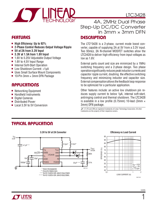 LTC3428 4A, 2MHz Dual Phase Step-Up DC/DC Converter in 3mm × 3mm DFN