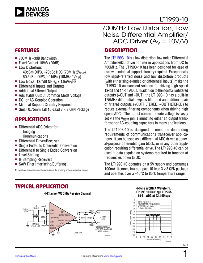 LT1993-10 700MHz Low Distortion, Low Noise Differential Amplifier/ADC Driver (A = 10V...