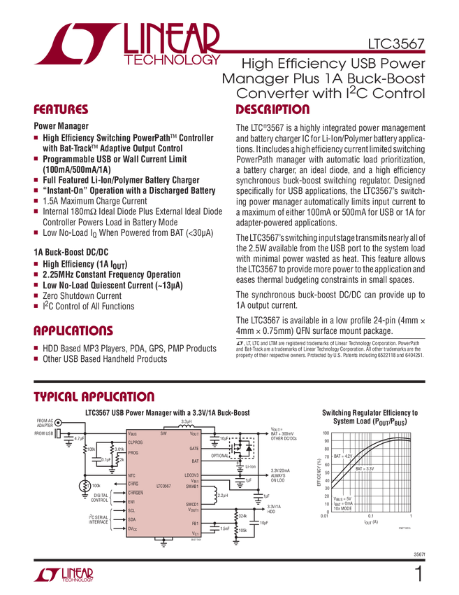 LTC3567 High Efficiency USB Power Manager Plus 1A Buck-Boost Converter with IC Contr...