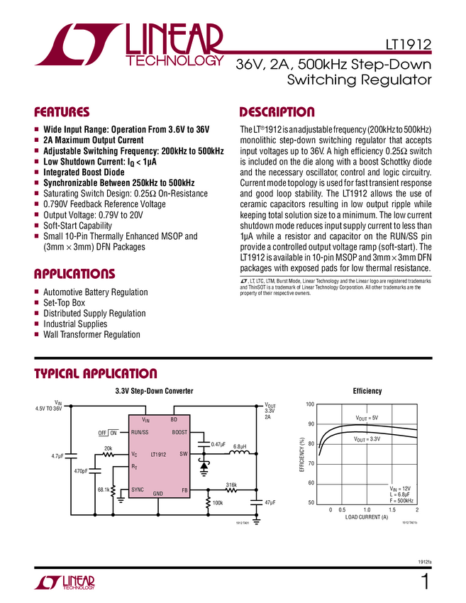 LT1912 36V, 2A, 500kHz Step-Down Switching Regulator