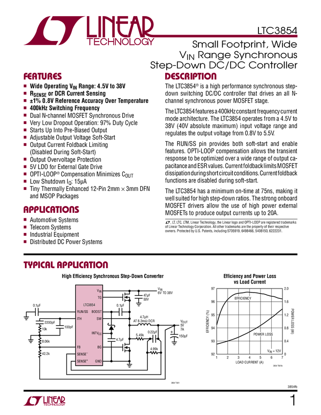 LTC3854 Small Footprint, Wide V Range Synchronous Step-Down DC/DC Controller