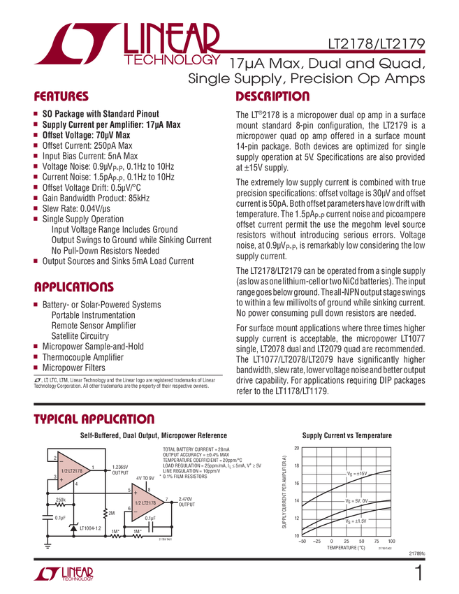 LT2178 17μA Max, Dual and Quad, Single Supply, Precision Op Amps
