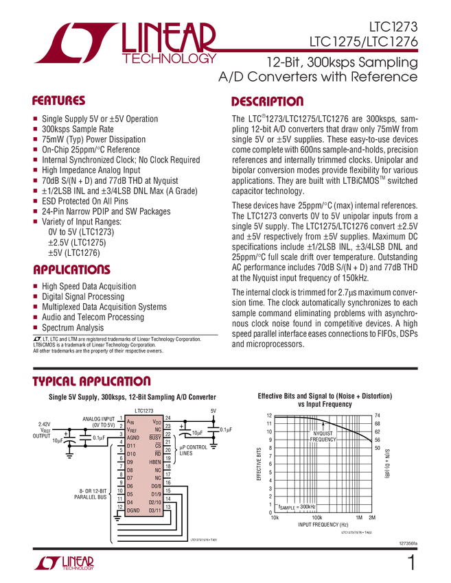 LTC1275 12-Bit, 300ksps Sampling A/D Converters with Reference