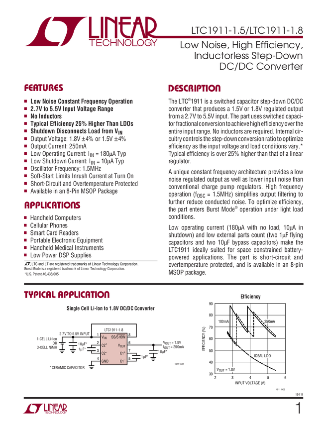 LTC1911 Low Noise, High Efficiency, Inductorless Step-Down DC/DC Converter