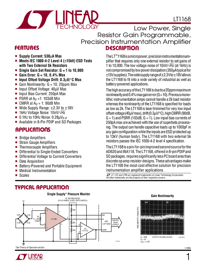 LT1168 Low Power, Single Resistor Gain Programmable, Precision Instrumentation Amp...