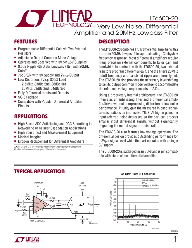 LT6600-20 Very Low Noise, Differential Amplifier and 20MHz Lowpass Filter