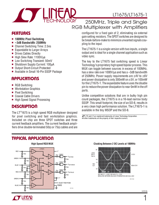LT1675 250MHz, Triple and Single RGB Multiplexer with Amplifiers