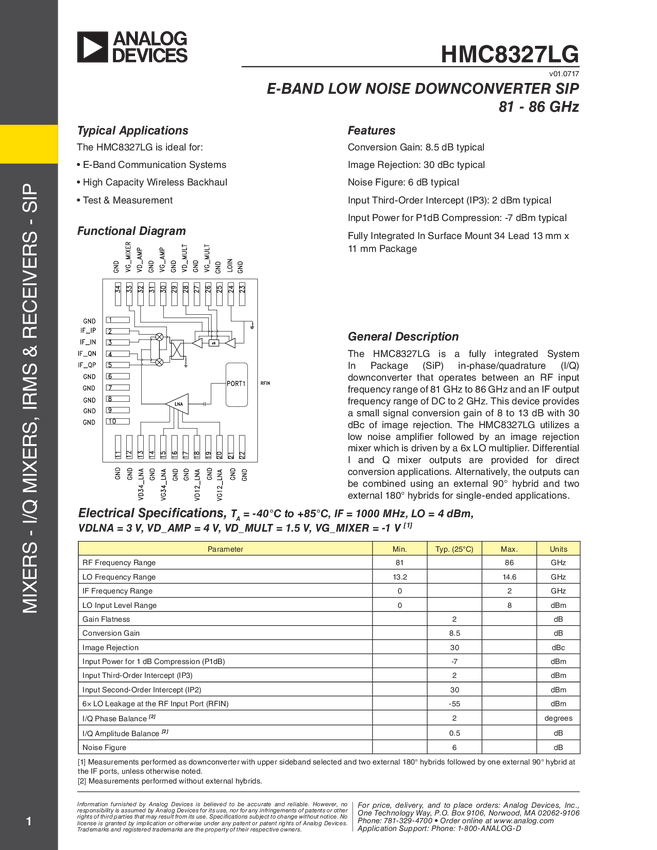 HMC8327 E-Band Low Noise Downconverter SiP 81 - 86 GHz
