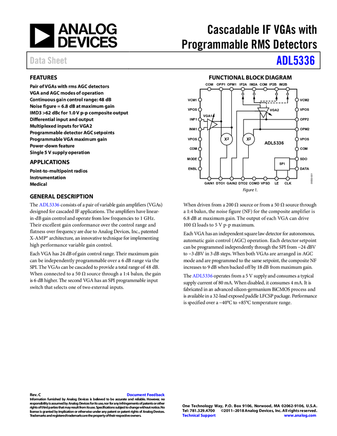 ADL5336 Cascadable IF VGAs with Programmable RMS Detectors