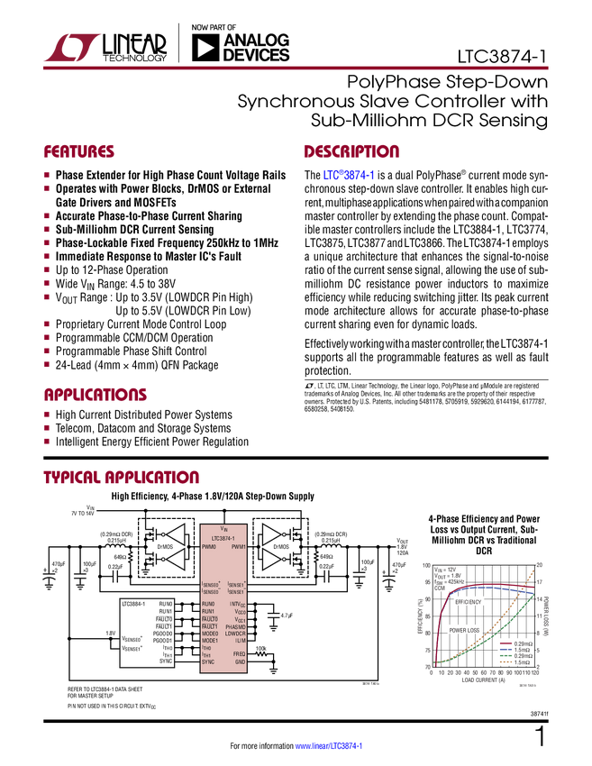 LTC3874-1 PolyPhase Step-Down Synchronous Slave Controller with Sub-Milliohm DCR Sens...