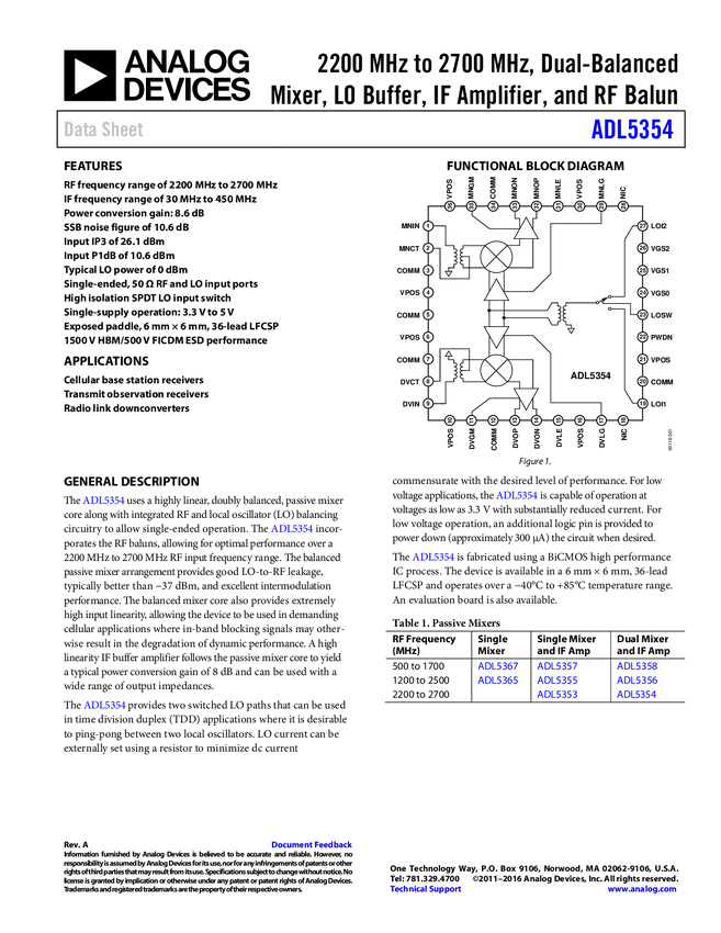 ADL5354 2200 MH TO 2700 MH, Dual-Balanced Mixer, LO Buffer, IF Amplifier, and RF Ba...