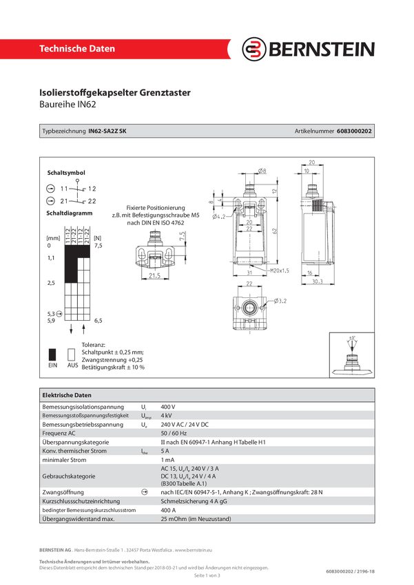 Przełącznik pozycyjny Bernstein IN62-SA2Z SK 6083000202, 240 V/AC, 5 A, IP67, 5 szt.