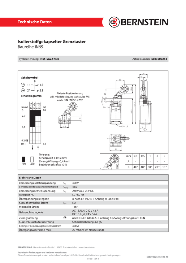 Przełącznik pozycyjny Bernstein IN65-SA2Z KNK 6083000263, 240 V/AC, 5 A, IP66/IP67, 5 szt.