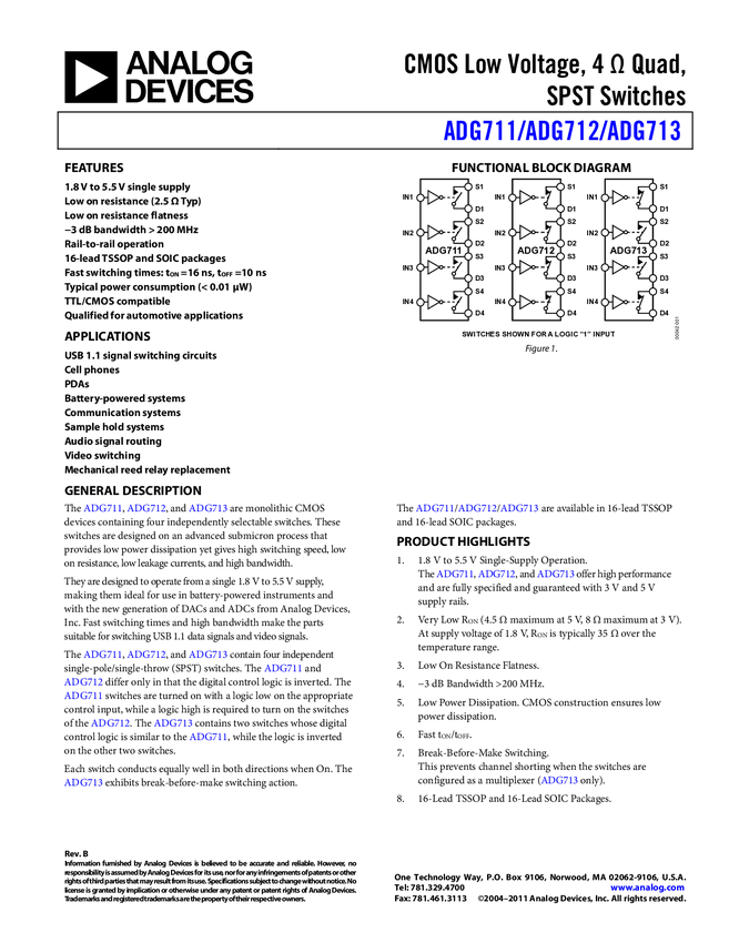 ADG712 CMOS Low Voltage 2.5 Ω Quad SPST Switch