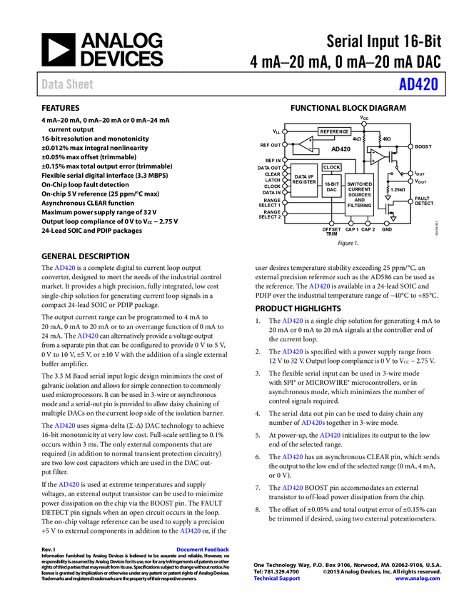 AD420 Serial Input 16-Bit, 4-20 mA, 0-20 mA DAC