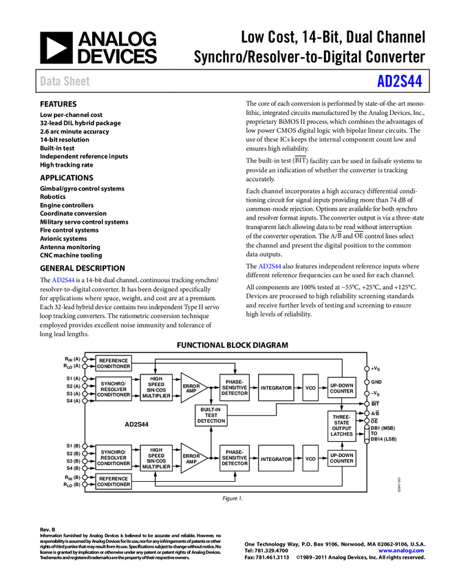 AD2S44 Low Cost, 14-Bit, Dual Channel Synchro/Resolver-to-Digital Converter