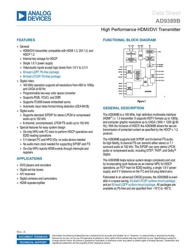 AD9389B High Performance HDMI/DVI Transmitter