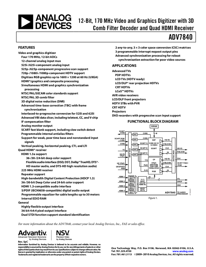 ADV7840 12-Bit, 170 MHz Video and Graphics Digitizer with 3D Comb Filter Decoder an...