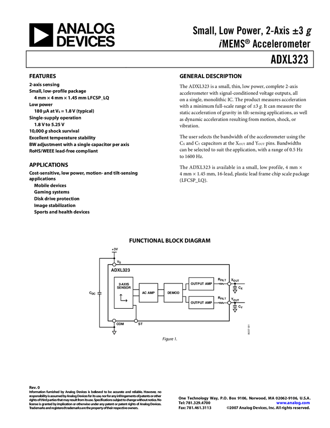ADXL323 Small, Low Power, 2-Axis ±3 MEMS® Accelerometer