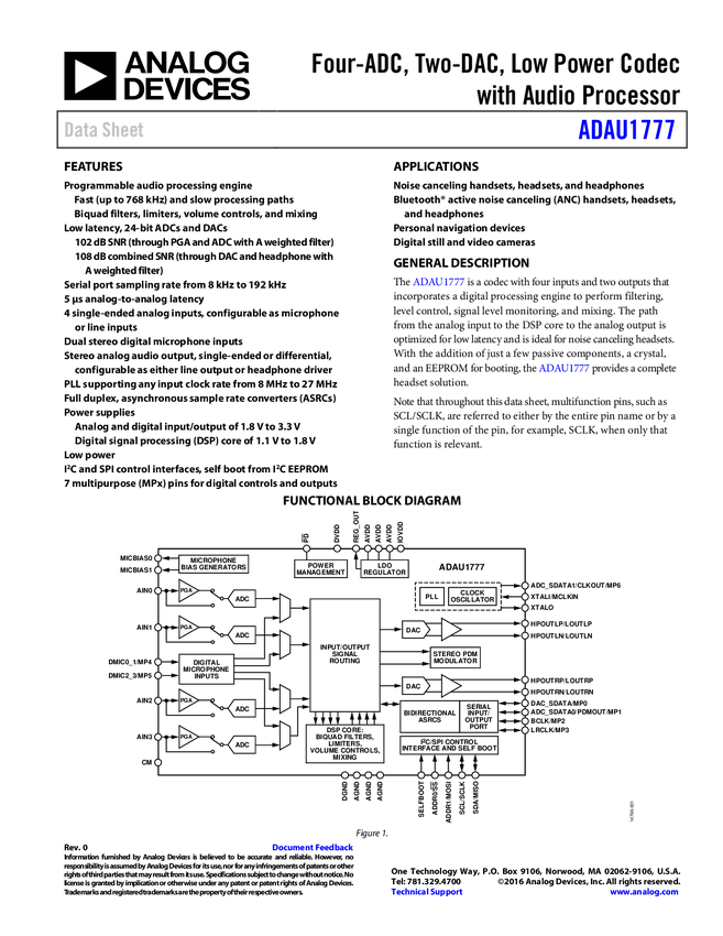 ADAU1777 Four-ADC, Two-DAC, Low Power Codec with Audio Processor