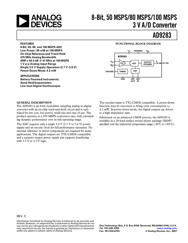 AD9283 8-Bit, 50 MSPS/80 MSPS/100 MSPS ADC