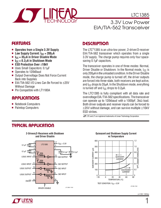 LTC1385 3.3V Low Power EIA/TIA-562 Transceiver