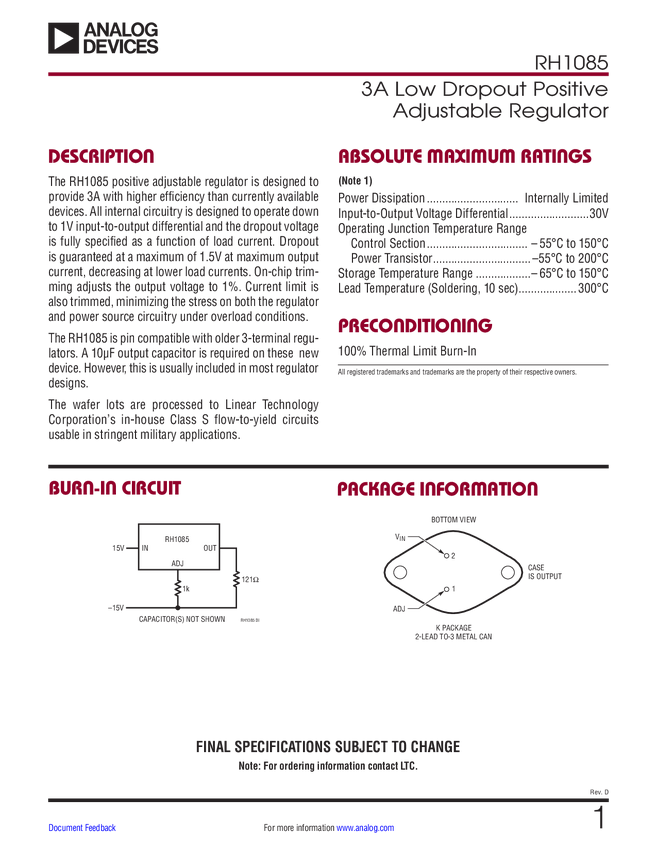 RH1085 3A Low Dropout Positive Adjustable Regulator
