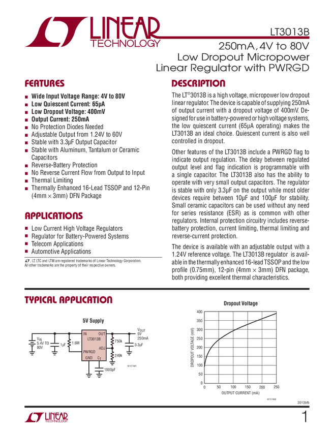 LT3013B 250mA, 4V to 80V Low Dropout Micropower Linear Regulator with PWRGD