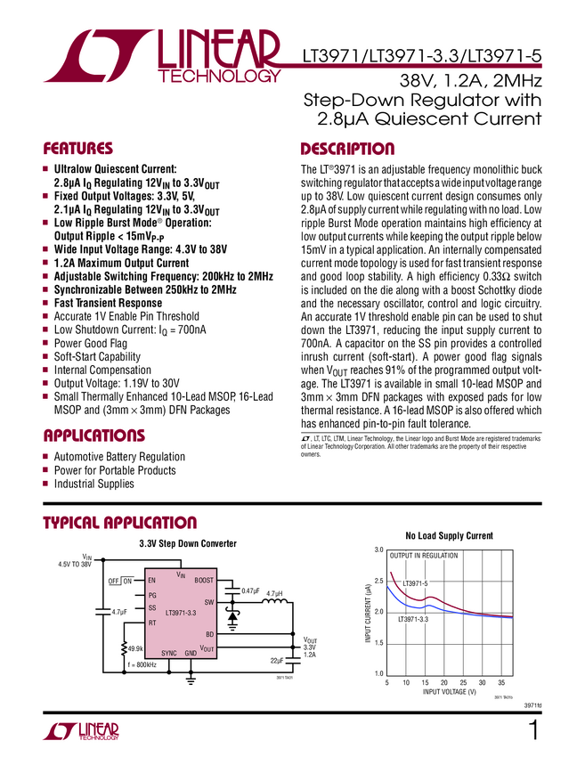 LT3971 38V, 1.2A, 2MHz Step-Down Regulator with 2.8μA Quiescent Current