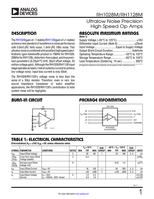 RH1028M Ultralow Noise Precision High Speed Op Amps