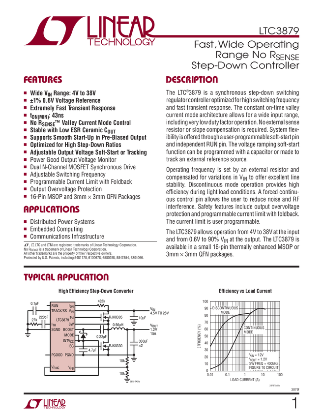 LTC3879 Fast, Wide Operating Range No R Step-Down Controller