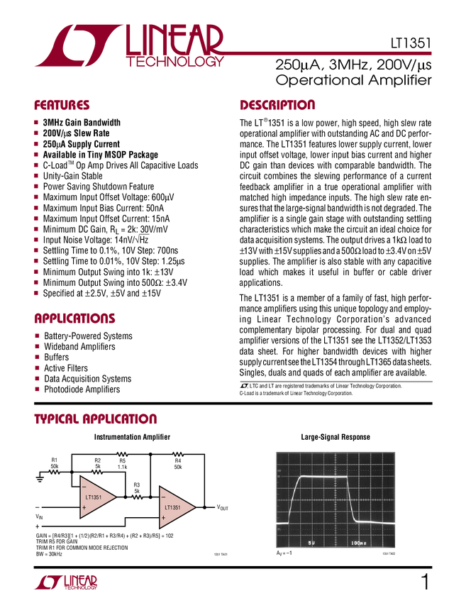LT1351 250µA, 3MHz, 200V/µs Operational Amplifier