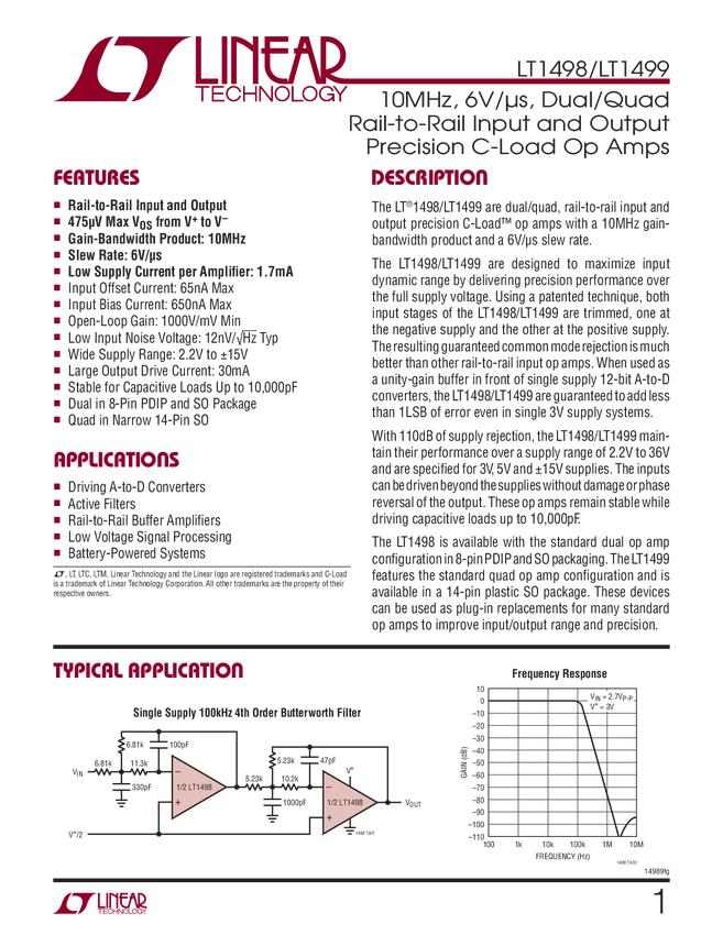 LT1498 10MHz, 6V/μs, Dual Rail-to-Rail Input and Output Precision C-Load Op Amps