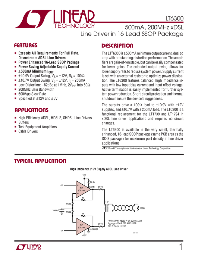 LT6300 500mA, 200MHz xDSL Line Driver in 16-Lead SSOP Package