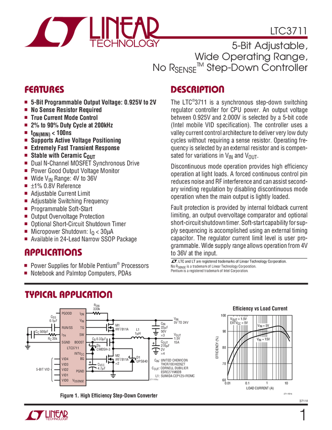 LTC3711 5-Bit Adjustable, Wide Operating Range, No R Step-Down Controller