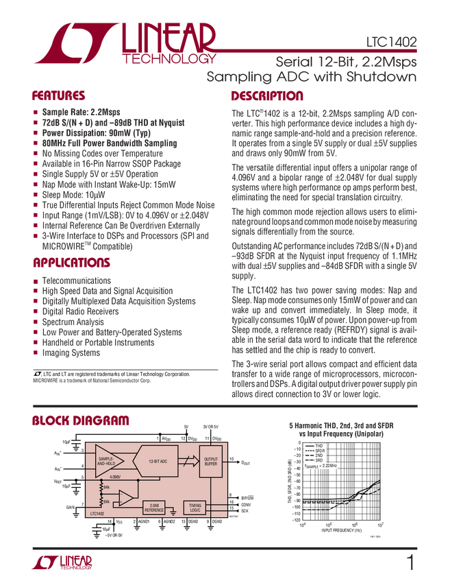 LTC1402 Serial 12-Bit, 2.2Msps Sampling ADC with Shutdown