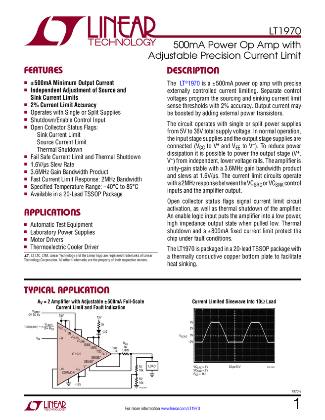 LT1970 500mA Power Op Amp with Adjustable Precision Current Limit