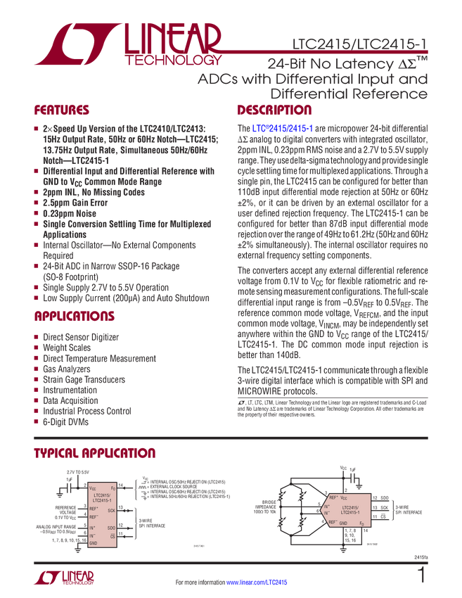 LTC2415 24-Bit No Latency Delta Sigma ADC with Differential Input and Differential...