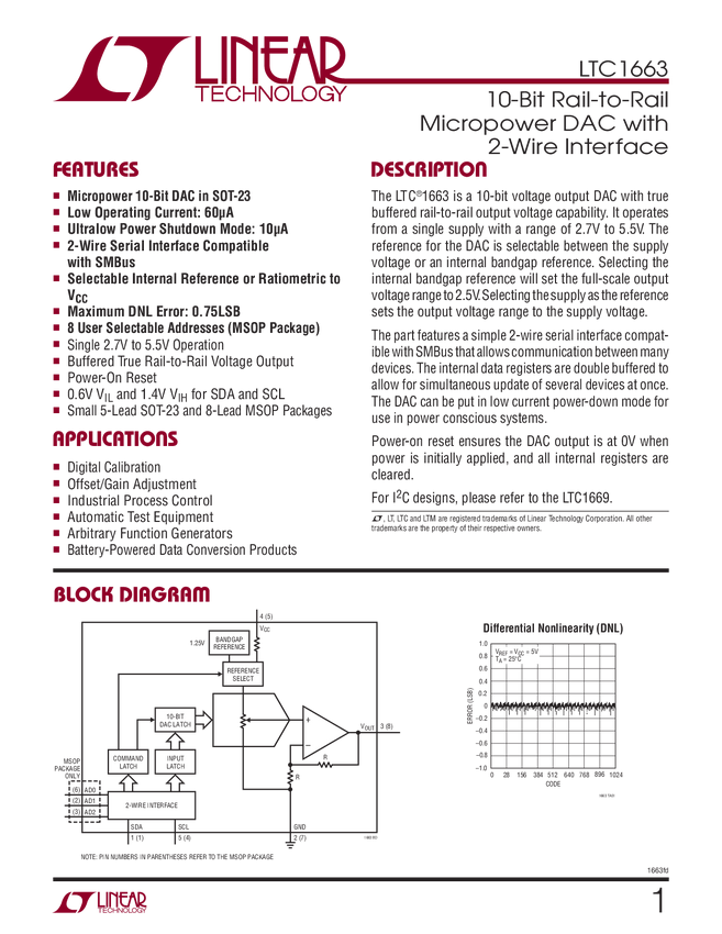 LTC1663 10-Bit Rail-to-Rail Micropower DAC with 2-Wire Interface