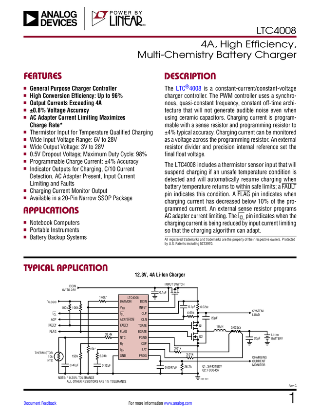 LTC4008 4A, High Efficiency, Multi-Chemistry Battery Charger