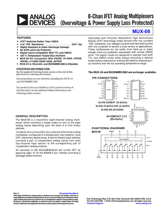 MUX08 8-Channel JFET Analog Multiplexers (Overvoltage & Power Supply Loss Protect...