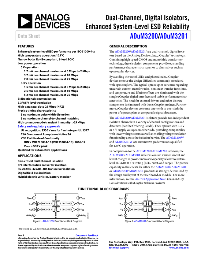 ADUM3200 Dual-Channel, Digital Isolator, Enhanced System-Level ESD Reliability