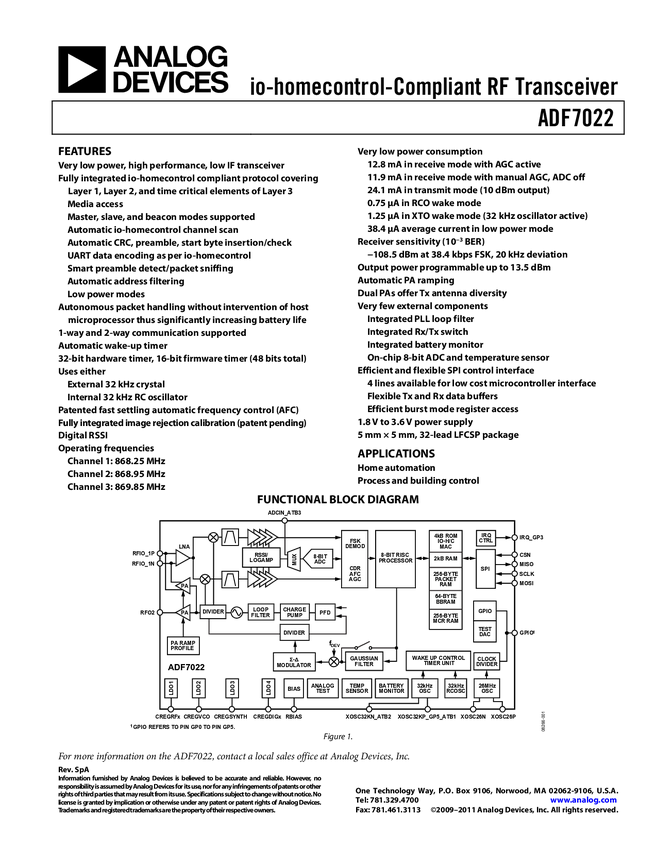 ADF7022 io-homecontrol Compliant RF Transceiver