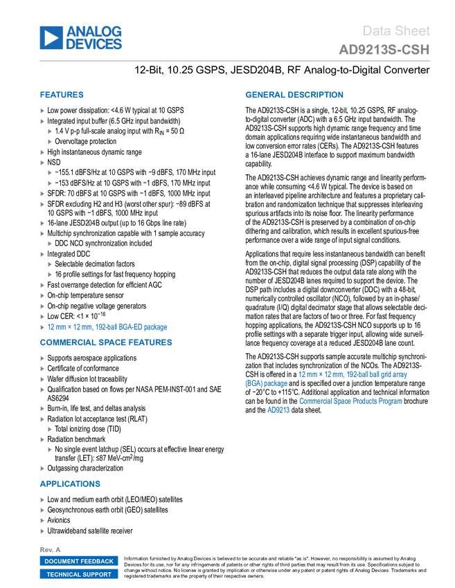 AD9213S 12-Bit, 10.25 GSPS, JESD204B, RF Analog-to-Digital Converter