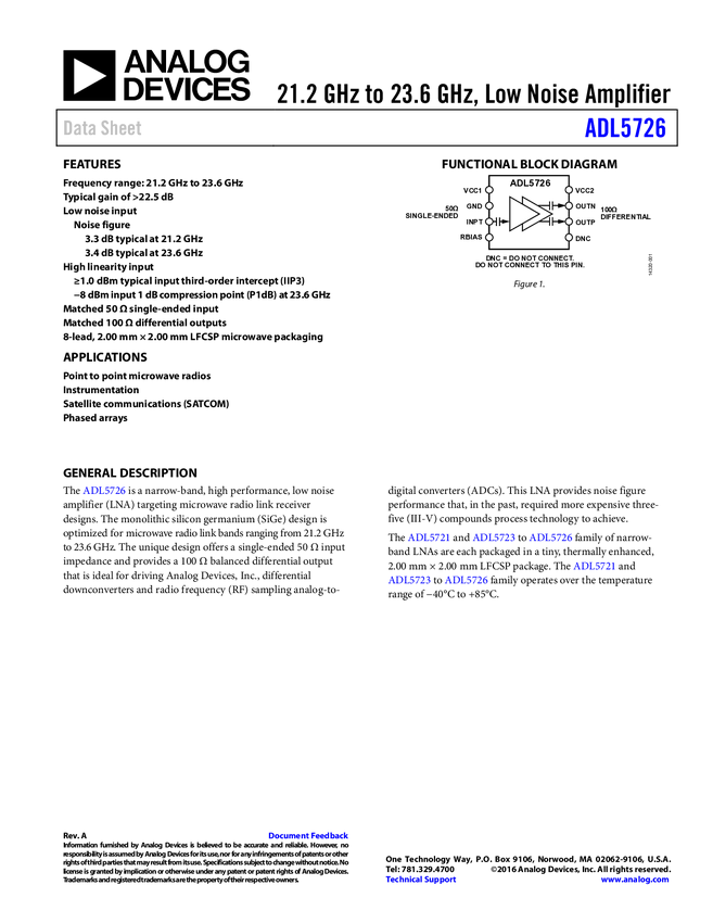 ADL5726 21.2 GHz to 23.6 GHz, Low Noise Amplifier