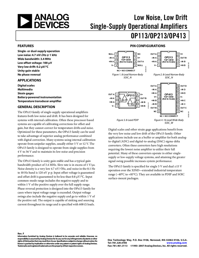 OP413 Low Noise, Low Drift Single-Supply Operational Amplifiers (Dual)