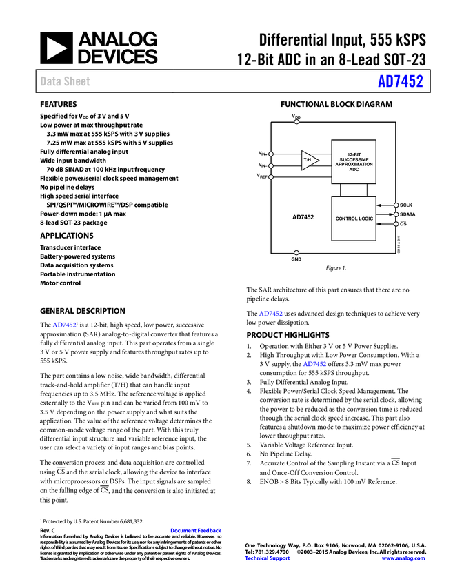 AD7452 Differential Input, 555 kSPS, 12-Bit A/D Converter in 8-Lead SOT-23
